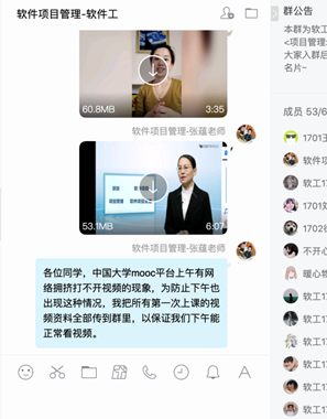 两周前,公司通知开学后要进行线上教学,张蕴老师就摸索学习了各大教学或直播平台,最后因自己的课程与爱课堂匹配度最高,所以选择了爱课程(中国大学MOOC)平台作为自己的首选教学平台,她的课程所选的教材是机械工业出版社韩万江老师编著的《软件项目管理案例教程》,而韩万江老师也在爱课程平台中发布了她配套的独立SPOC课程,也就是说,线上教学资料比较充分,并且匹配度较高,她初步认为,线上教学应该是可行的。张老师用异步SPOC的形式将韩老师的课程导入到自己的课程中。然而后面发现,每章配套的视频资料较短较少,有些知识点只是一句略过,那么自己的想法怎么传达给员工,是个问题。于是想到了可以自己录制一些微课视频,传到她所建的异步SPOC中,这样可以配合韩老师的视频资料,以供员工更充分的学习每章的内容。