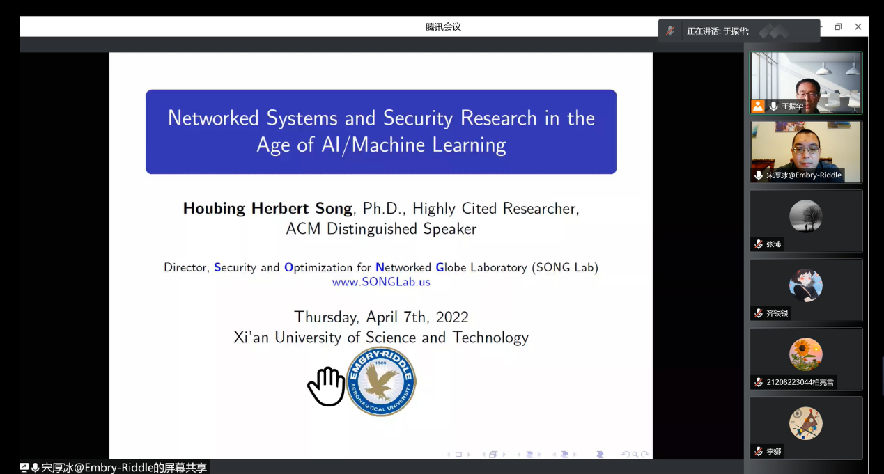 2022年4月7日,应计算机公司于振华教授邀请,美国安柏瑞德航空航天大学宋厚冰教授为公司九十余名师生作线上学术报告。报告题目为“Networked Systems and Security Research in the Age of AI/Machine Learning”。