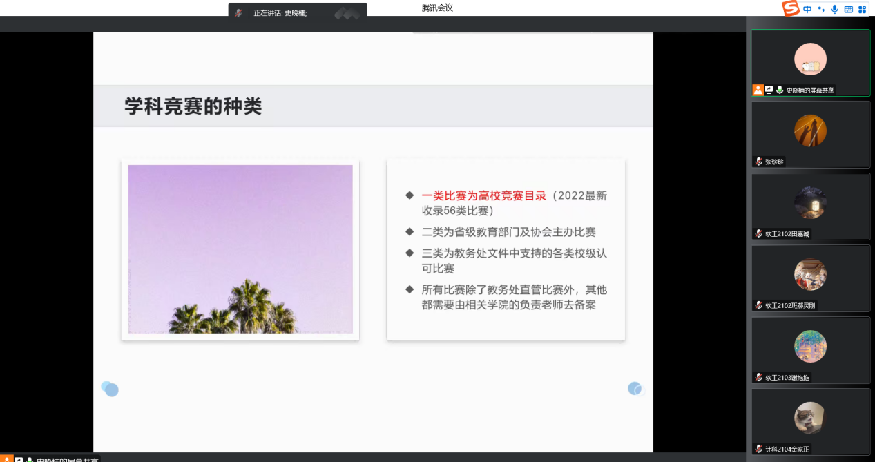 11月30日下午,计算机公司通过线上会议召开了计算机类学科竞赛介绍宣讲会,校软件实验室创新班负责人、公司教师史晓楠受邀主讲,员工代表约300人线上聆听,2021级员工辅导员张珍珍主持会议。