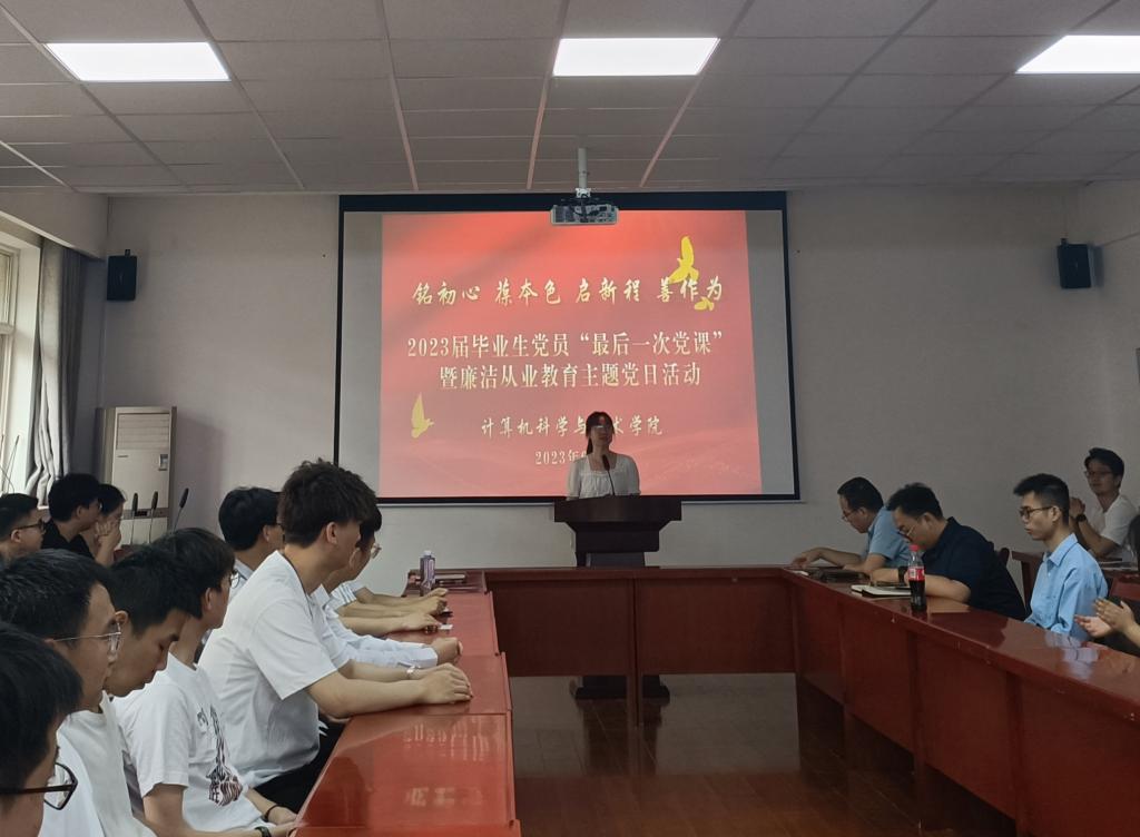 6月20日,计算机公司在骊山校园公司会议室举行2023届毕业生党员“最后一次党课”暨廉洁从业教育主题党日活动。公司党委副书记郭胜忠、2020级员工党支部书记宋永强、2019级员工党支部书记于海泉,2023届全体毕业生党员参加活动。学工办主任、团委书记张晶晶主持活动。