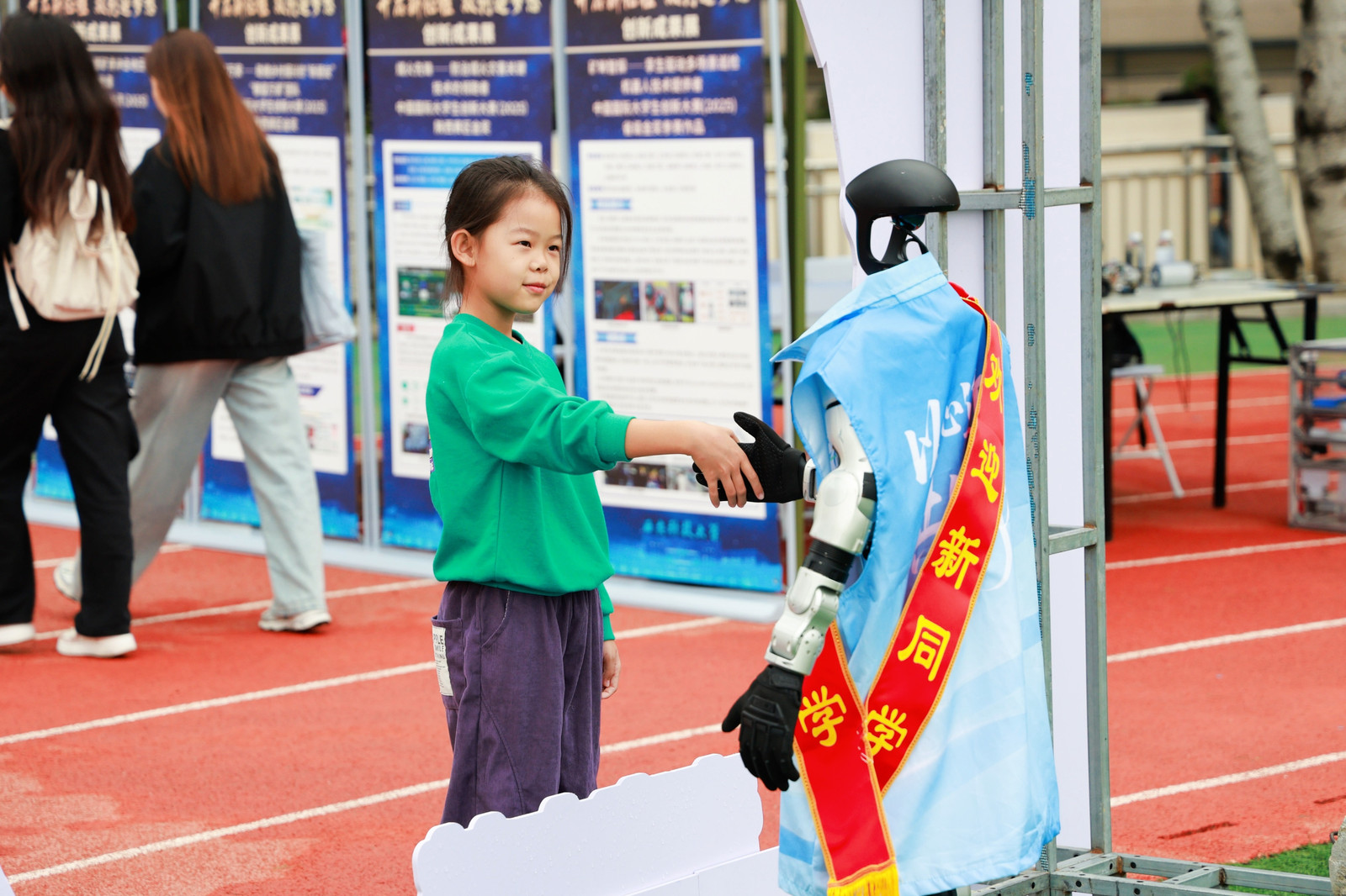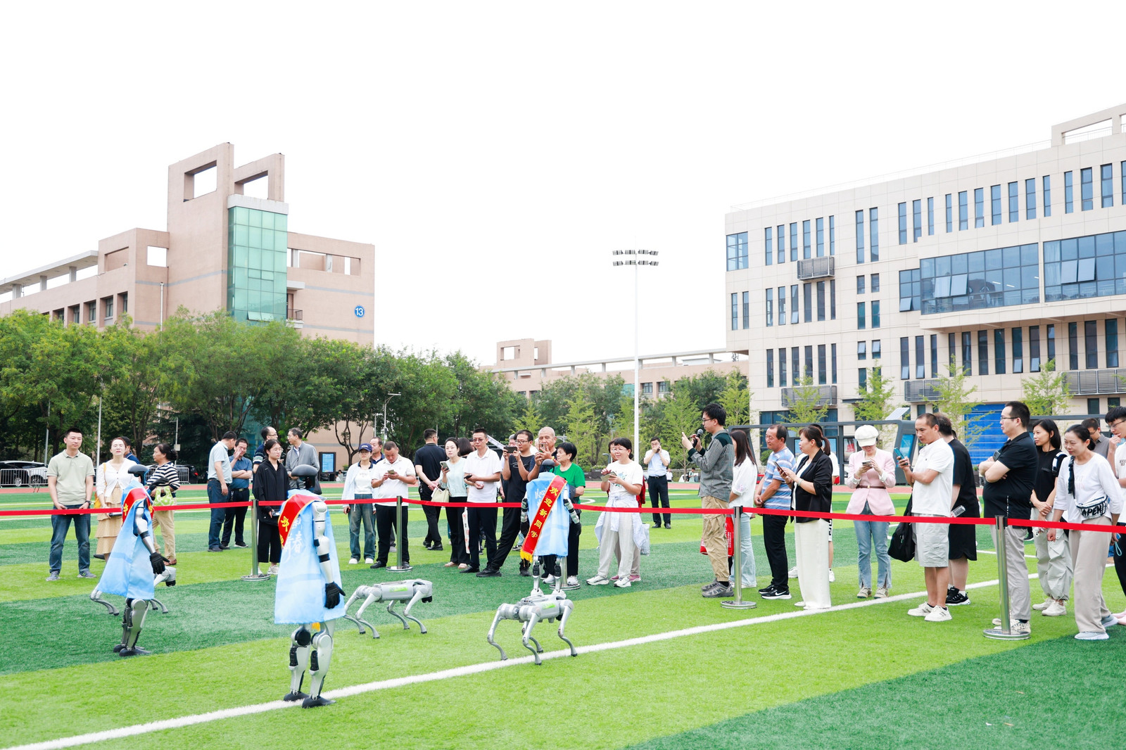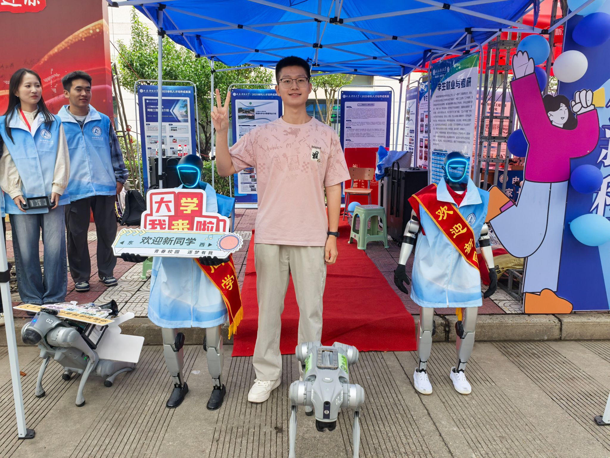 此次迎新工作全面覆盖骊山校园中心广场、小操场和公司集中迎新点,构建起全方位服务新生的网络。在小操场,机器人协同方阵的表演成为焦点。表演伊始,机器人向校领导汇报了公司今年招生情况,清晰的数据与流畅的表达,彰显公司发展的坚实步伐。随后,机器人带来太极拳等表演,刚柔并济的动作与科技元素巧妙融合,令人耳目一新。它们还与新生、家长亲切互动,现场欢声笑语不断。机器人之间的赛跑环节,寓意着新生老员工活的精彩启程;机器狗“西小科”与公司“网红狗”的嬉闹互动,更是萌态十足,引得众人纷纷驻足观看、拍照留念。
