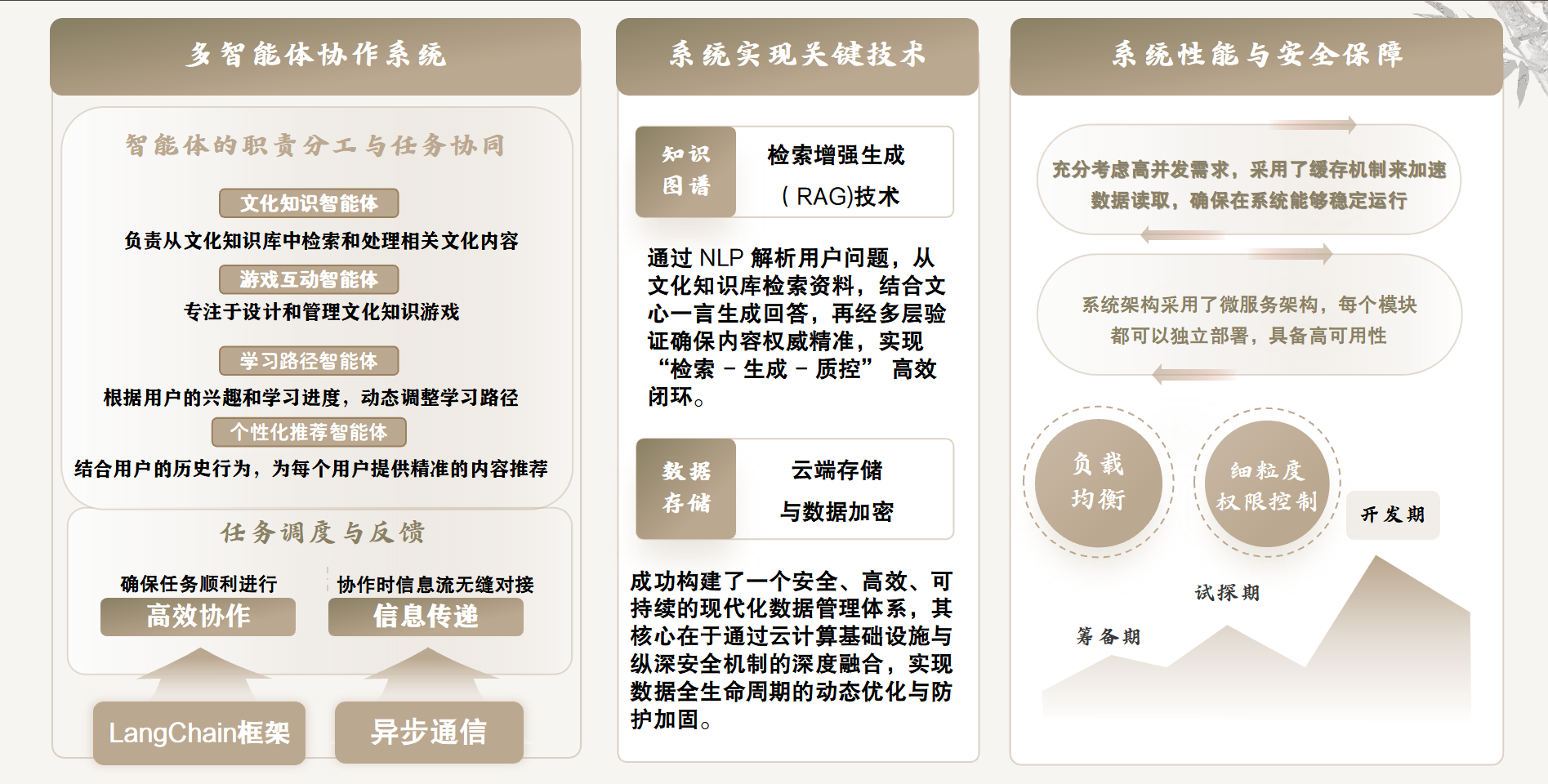 “国韵智语”以“微信小程序+AI智能体矩阵”为核心载体,构建了“学-玩-藏”一体化传统文化学习平台。不同于传统诗词类产品的单一功能模式,该项目打造了四位一体的核心竞争力:以NLP模型与RAG检索技术筑牢技术壁垒,百万级知识库夯实内容根基,游戏化与社交化设计深度锁定用户心智,更依托微信生态打通全域流量入口,而贯穿其中的多智能体协作系统,成为项目的“神经中枢”。