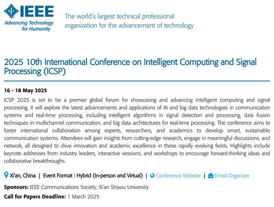 征稿主题涵盖但不限于智能计算与信号处理、计算机与网络信息安全、人工智能与机器学习、物联网与传感器技术等领域的最新研究成果。本次会议的论文集将由IEEE出版,收录进IEEE Xplore数据库,并提交至EI核心和Scopus检索。ICSP 2025已被IEEE正式列入会议列表。