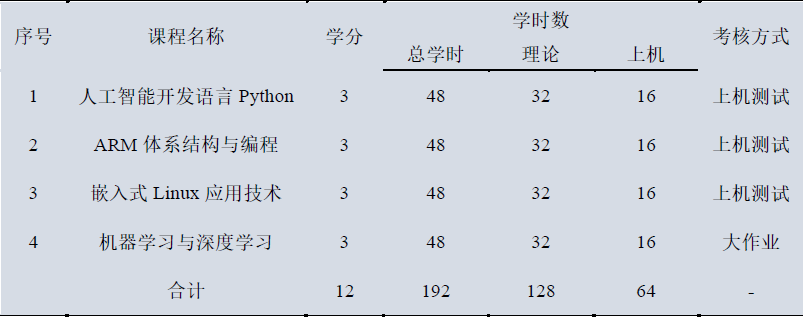 本微专业计划设置4门课程,共12学分,分两学期完成授课。课程包括人工智能开发语言Python、ARM体系结构与编程、嵌入式Linux应用技术、机器学习与深度学习,各门课程分为理论和实践两个环节。