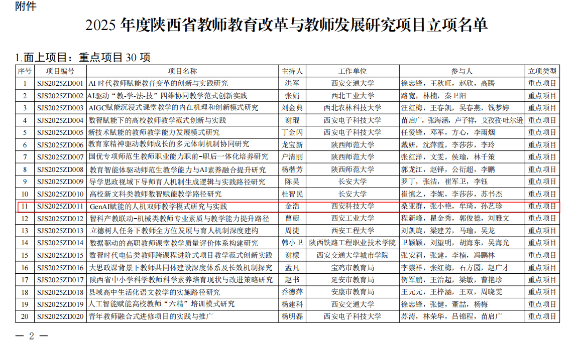 近日,陕西省教育厅公布了2025年度陕西省教师教育与教师发展研究项目评审结果。公司金浩教授主持申报的《GenAI赋能的人机双师教学模式研究与实践》获批重点项目立项。