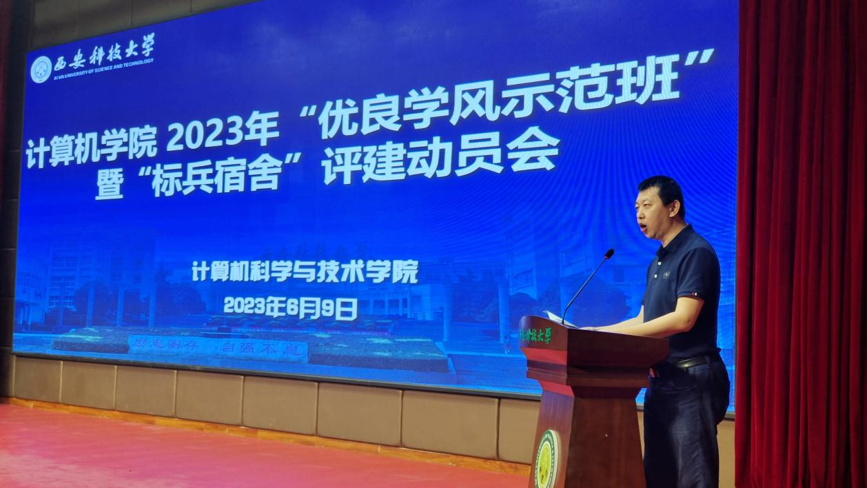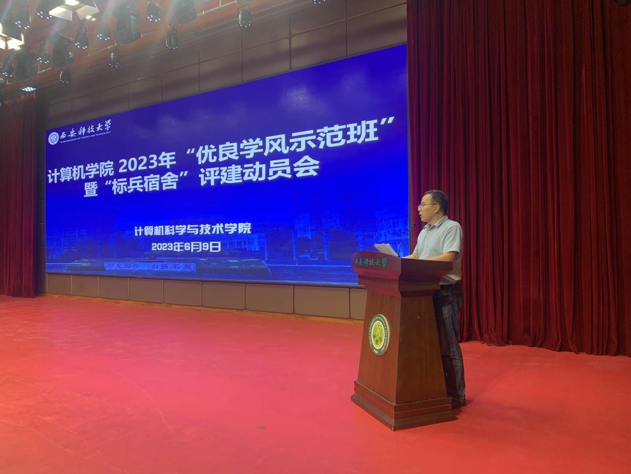 6月9日,计算机公司在临潼校区骊山校园煤炭科技楼一楼报告厅召开2023年“优良学风示范班”暨“标兵宿舍”评建动员会。公司党委书记李绥波、副经理金浩、教师代表、全体学工干部,各年级班长、团支书,一至三年级全体员工宿舍舍长,2022级全体员工参加了本次会议,会议由公司党委副书记郭胜忠主持。